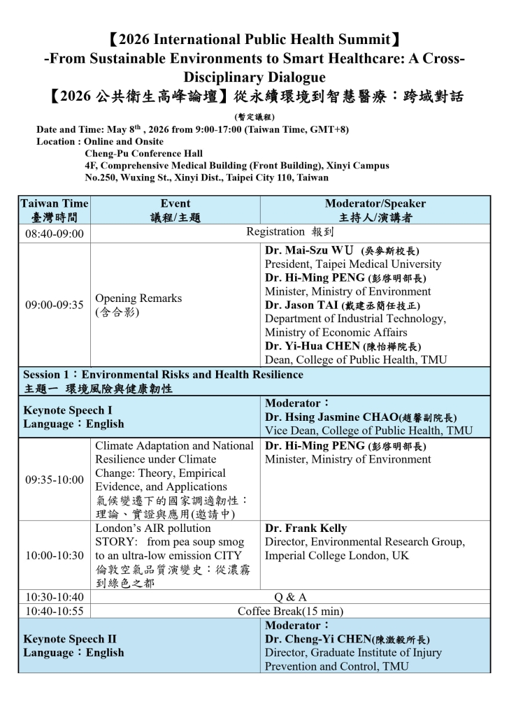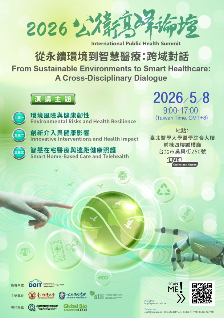 臺北醫學大學公共衛生學院將於2026/5/08(五) 舉辦「2026公衛高峰論壇」,敬請踴躍報名參加