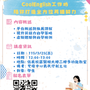 115.03.25 EMI學生講座:《CoolEnglish工作坊》2026-02-12/在: 學生--英語檢定課程及考試資訊, EMI 雙語計畫專區 https://cphn.tmu.edu.tw/wp-content/uploads/2026/02/115.03.25酷英網工作坊-scaled.png 2560 1810 m513096009 /wp-content/uploads/2025/03/logo.png m5130960092026-02-12 18:13:222026-02-12 18:13:22115.03.25 EMI學生講座:《CoolEnglish工作坊》