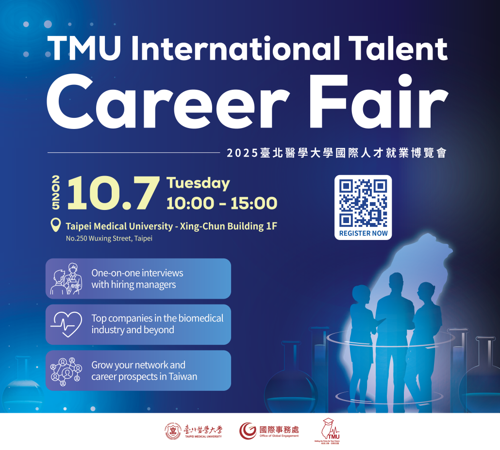 The 2025 TMU International Talent Career Fair is your golden chance to meet leading employers from Taiwan’s healthcare and related industries—and it’s happening on October 7, 10:00–15:00 at TMU i College (Xing-Chun Building, 1F).